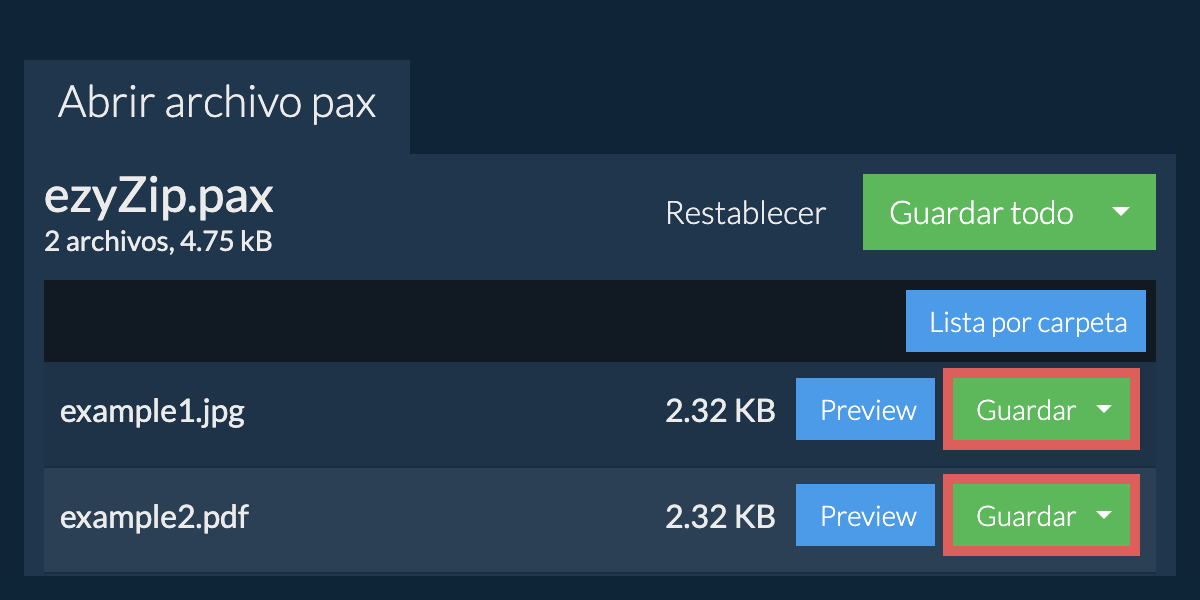 Comenzará la extracción del archivo y enumerará los contenidos del archivo PAX una vez completada. - Haga click en el botón verde “Guardar” de los archivos individuales para guardar a su disco local.