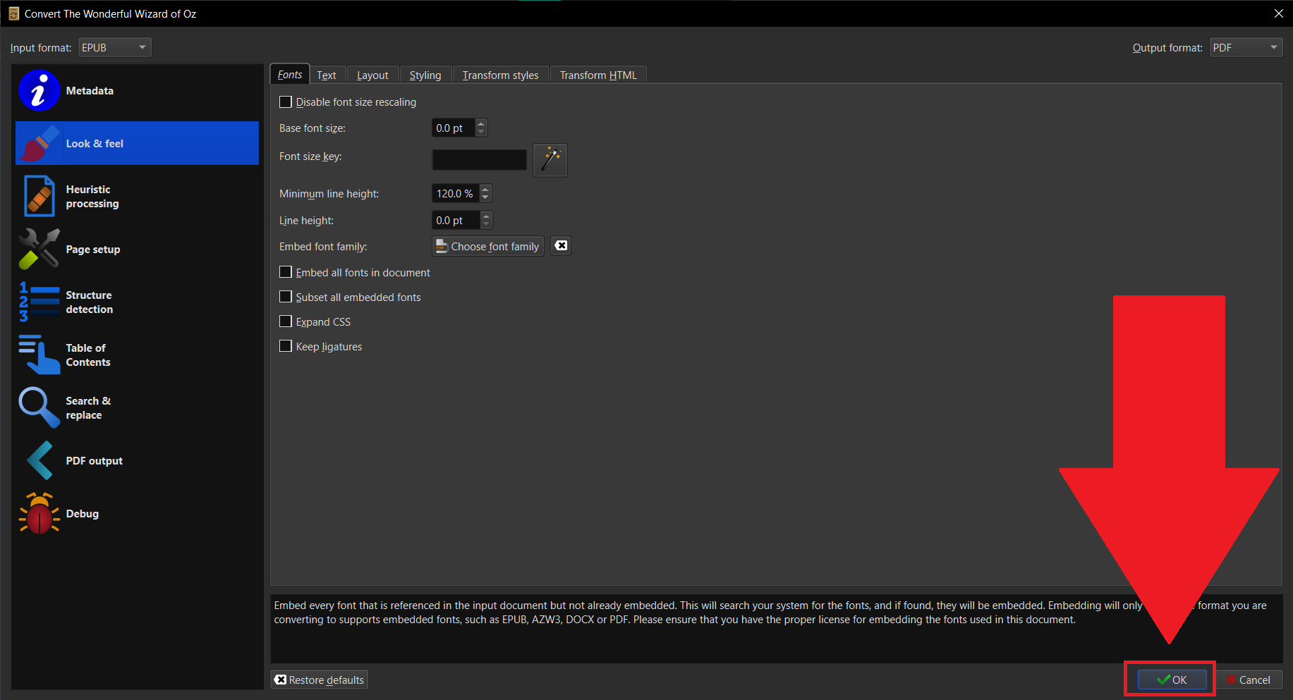 - Start Conversion: Click “OK” to start the conversion. Calibre will work its magic, and soon you’ll have a new PDF.