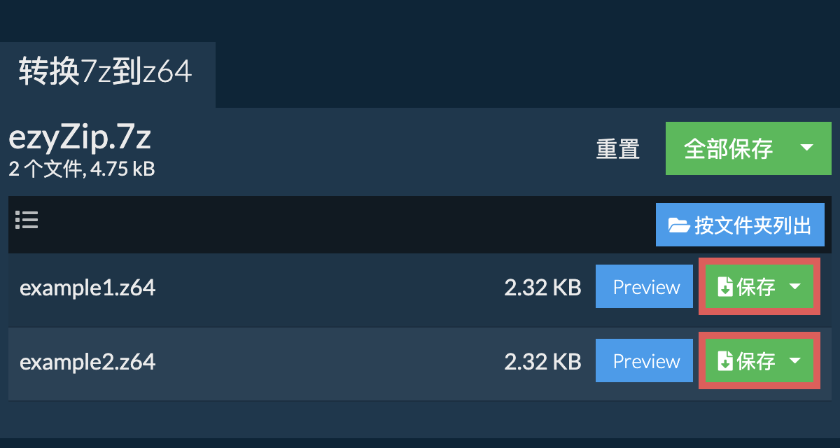 点击"转换为Z64"按钮,系统将列出7Z压缩包中的所有Z64文件 - 点击各个文件上的绿色"保存"按钮,将文件保存到您的设备