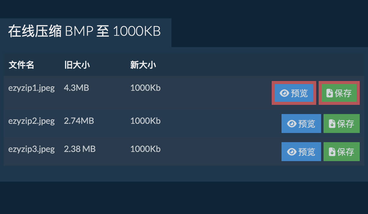使用 ezyZip 在线压缩 BMP 至 1000KB 的分步说明。