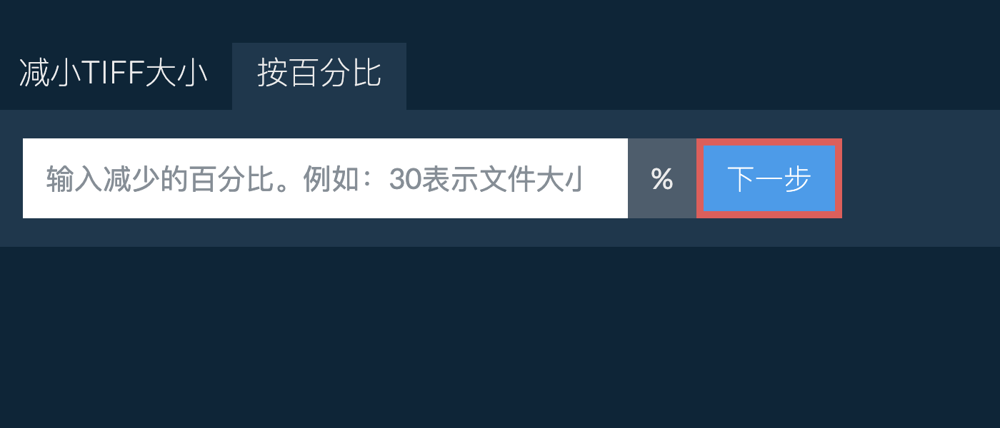 - 要按百分比减少TIFF,请点击“按百分比”标签并输入您希望的减少百分比。例如:30表示文件大小减少30%,然后点击“下一步”。