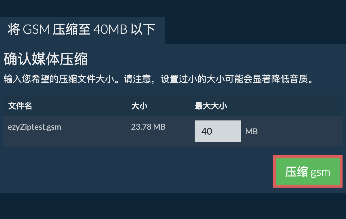 ezyZip 是一个在您的浏览器中运行的免费在线 gsm 至 40MB 文件大小减小工具。无需安装任何额外的压缩软件。它还支持许多其他媒体压缩。