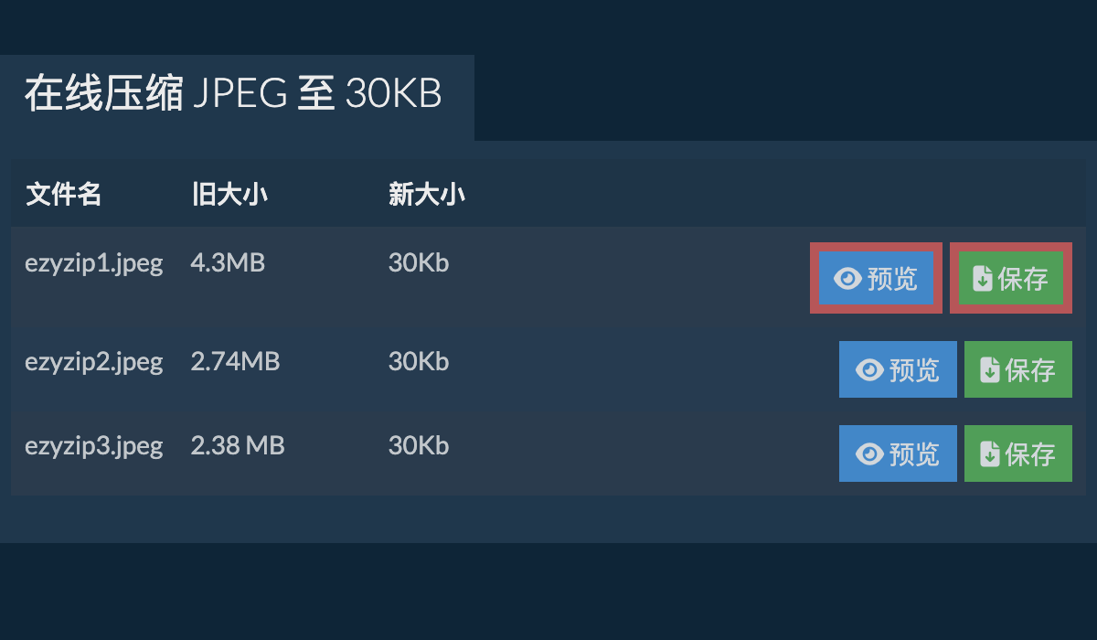 - 一旦所有文件压缩完毕,将再次呈现这些文件。点击“预览”在浏览器中查看新图像。如果您满意,那么点击“保存”将压缩文件保存到您的电脑。