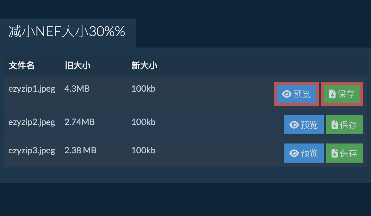 - 一旦所有文件被压缩,您将再次被呈现这些文件。点击“预览”在浏览器中查看新图像。如果您满意,然后点击“保存”将压缩文件保存到您的计算机上。