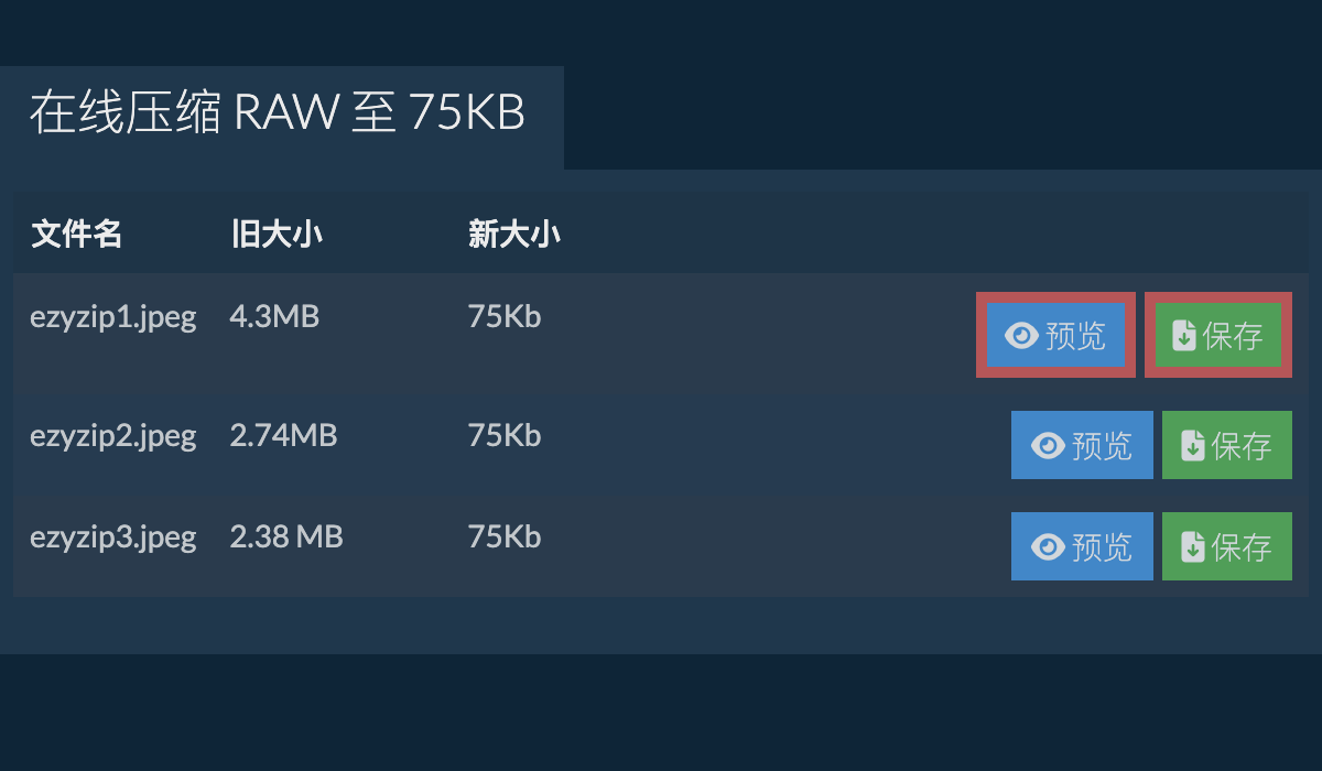 使用 ezyZip 在线压缩 RAW 至 75KB 的分步说明。