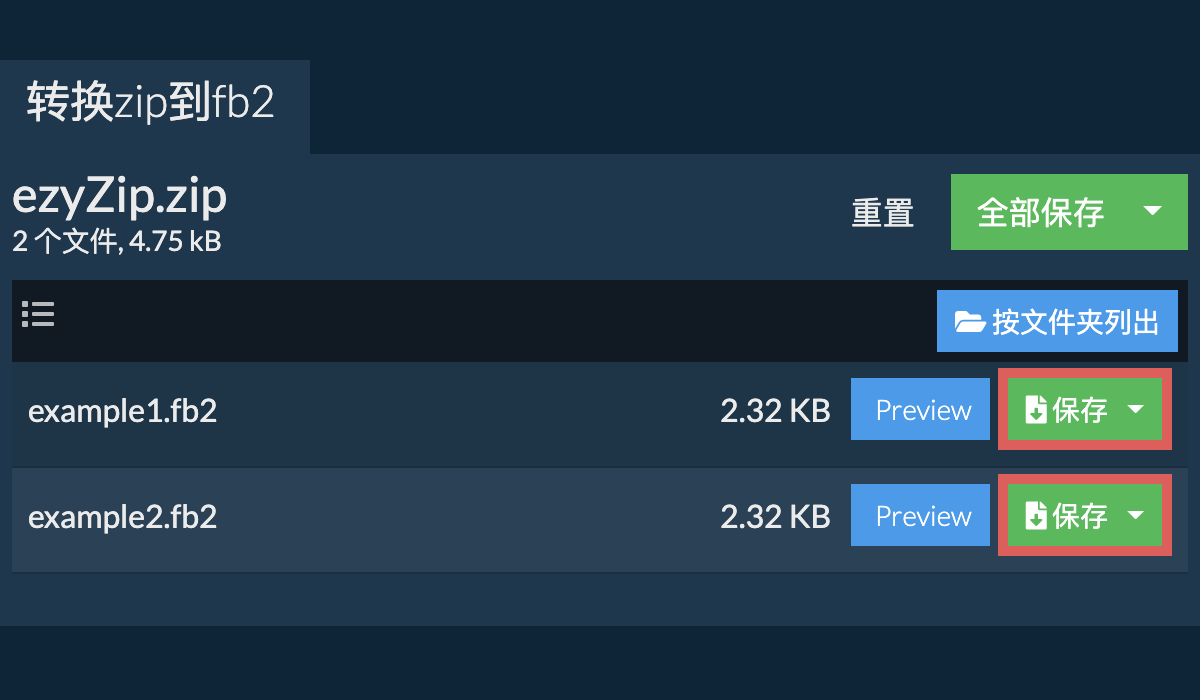 - 点击"保存"或"全部保存"按钮,将FB2文件保存到Dropbox。首次使用时需要授权。文件将保存在/Apps/ezyZip文件夹中