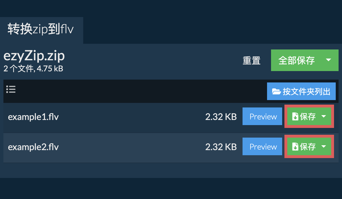 点击"转换为FLV"按钮,系统将列出ZIP压缩包中的所有FLV文件 - 点击各个文件上的绿色"保存"按钮,将文件保存到您的设备