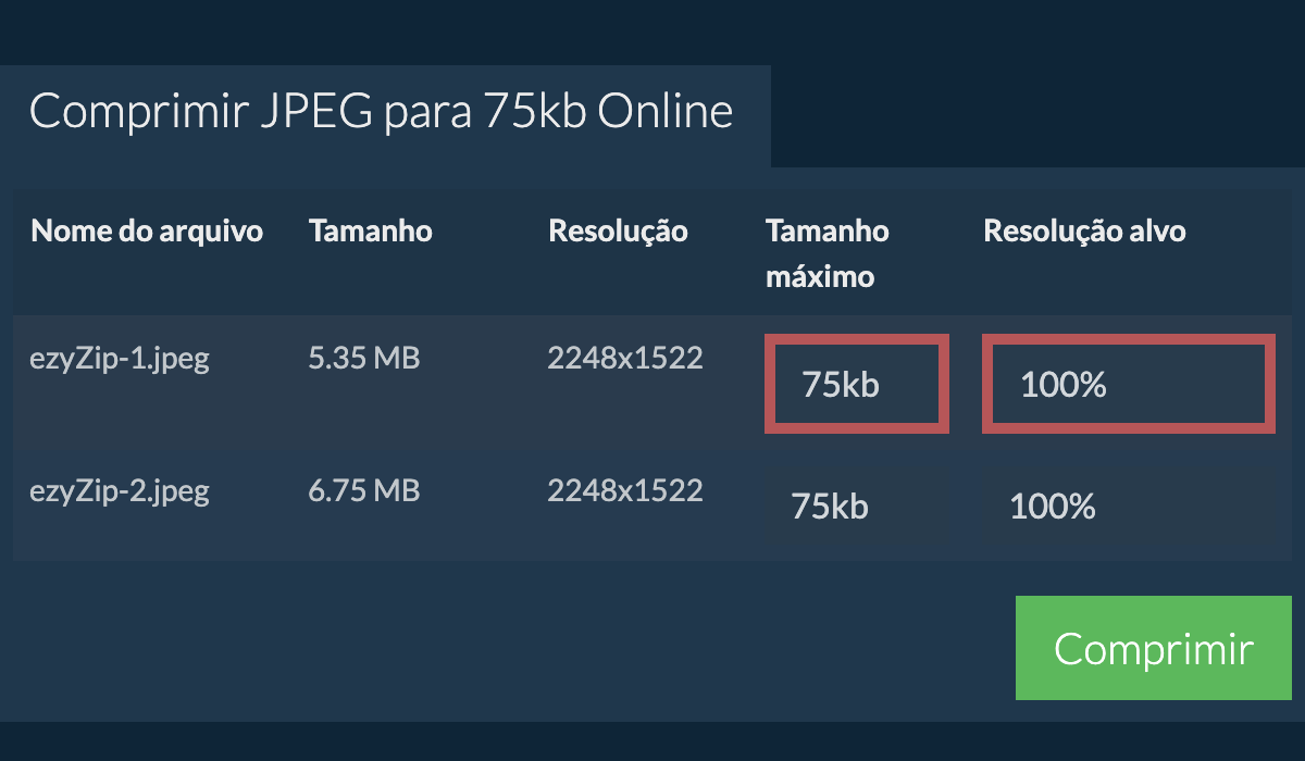 Instruções passo a passo mostrando como comprimir JPEG para 75kb online usando ezyZip.