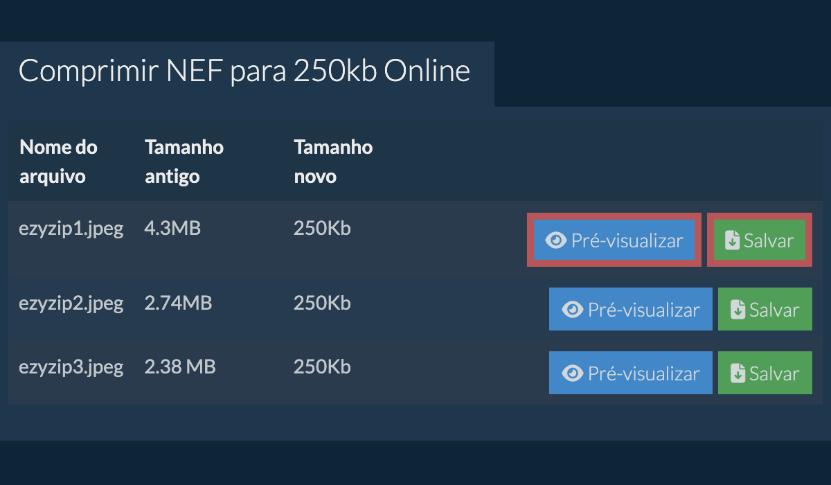 - Depois que todos os arquivos forem comprimidos, eles serão apresentados novamente. Clique em "Pré-visualizar" para ver as novas imagens no navegador. Se estiver satisfeito com isso, clique em "Salvar" para salvar os arquivos comprimidos no seu computador.