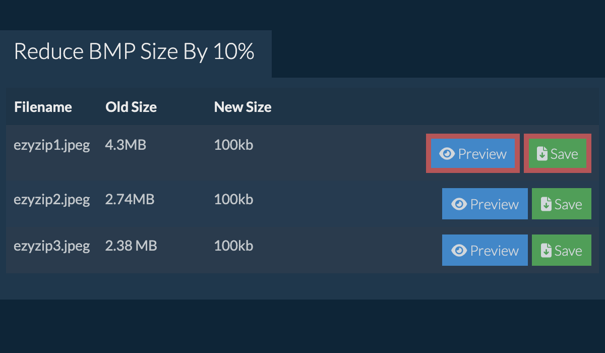 - Once all files have been compressed, you will be presented with files again. Click on "Preview" to see the new images in browser. If you are happy with it, then click on "Save" to save the compressed files to your computer.