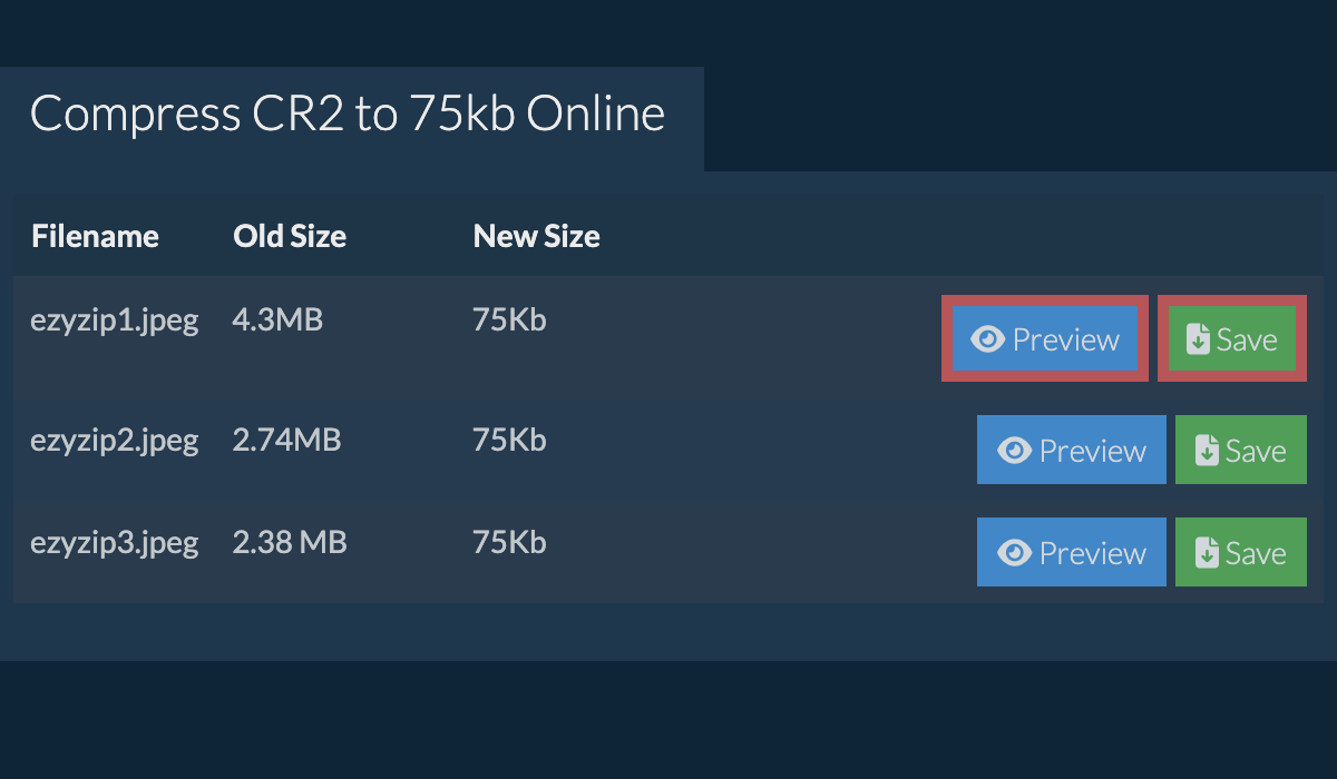 ezyZip is a set of utilities for dealing with compressed files. It is a free online utility to compress your files to a smaller size, including this CR2 to 75kb file size reducer. No need to install any additional software. It supports a myriad of other image compression options too.