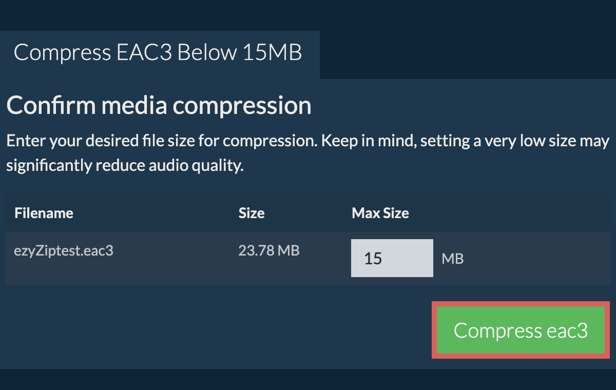 ezyZip is a free online eac3 to 15MB file size reducer that runs in your browser. No need to install any additional compression software. It supports a myriad of other media compressions too.