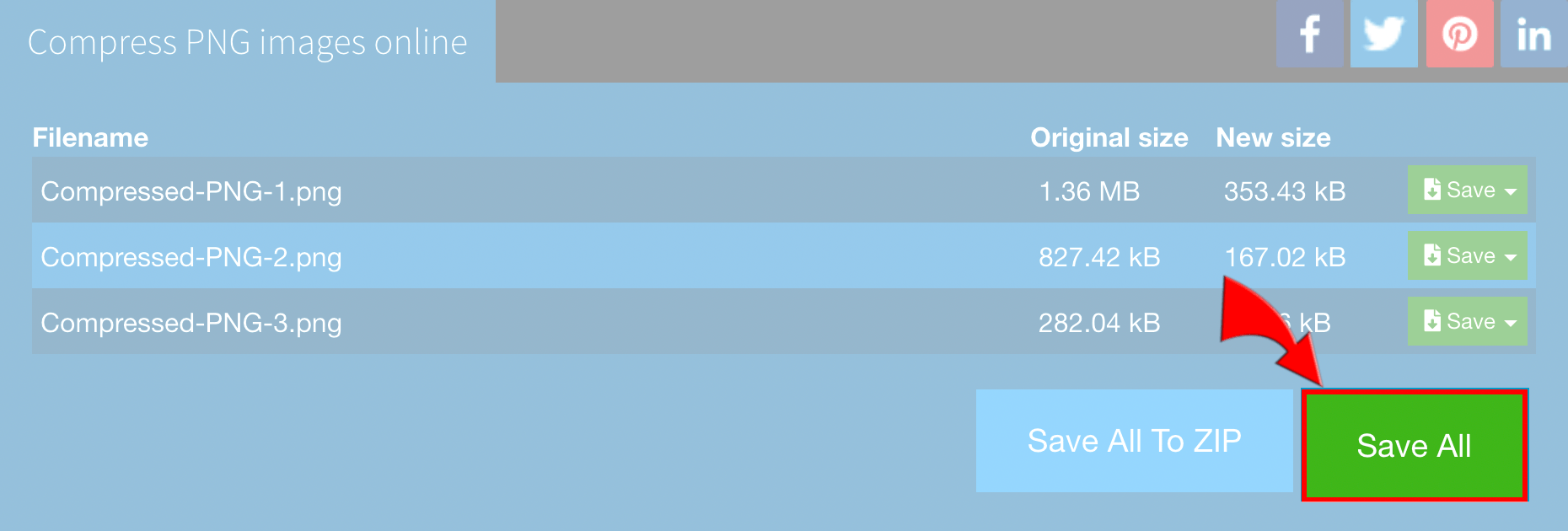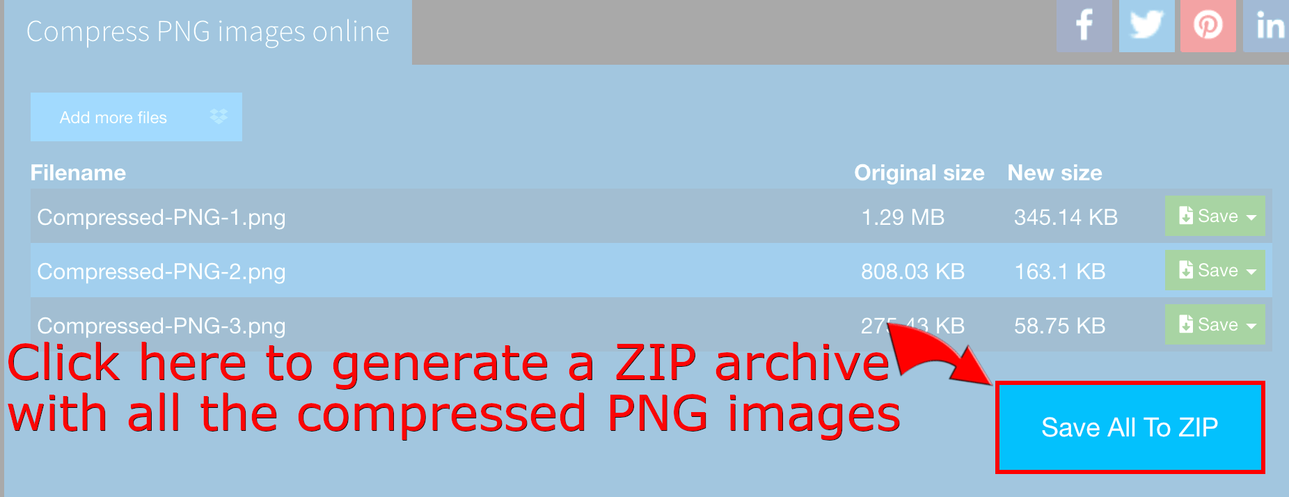 - Alternately you can click "Save All To ZIP" to save all the compressed PNG files to a single ZIP archive.