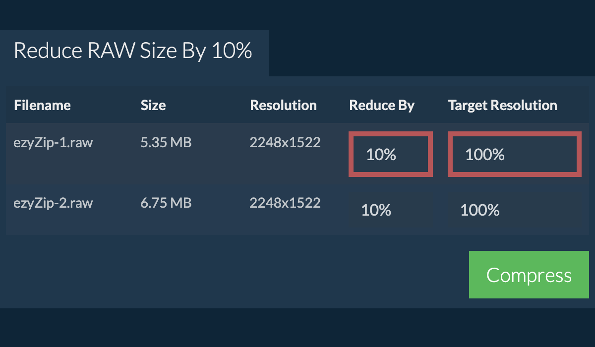 ezyZip is a set of utilities for dealing with compressed files. It is a free online utility to compress your files to a smaller size, including this tool to reduce RAW files by 10%. No need to install any additional software. It supports a myriad of other image compression options too.