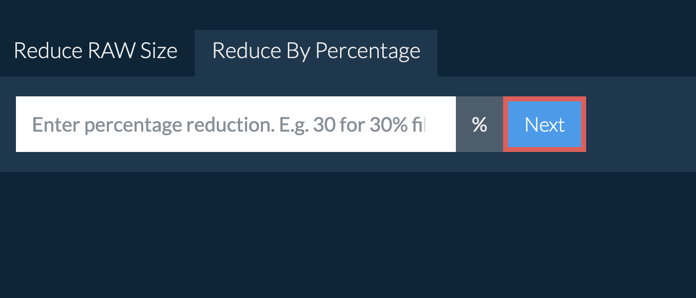 - To reduce RAW by percentage, click the "By Percentage" tab and enter your desired percentage reduction. E.g. 30 for 30% file size reduction and click "Next".