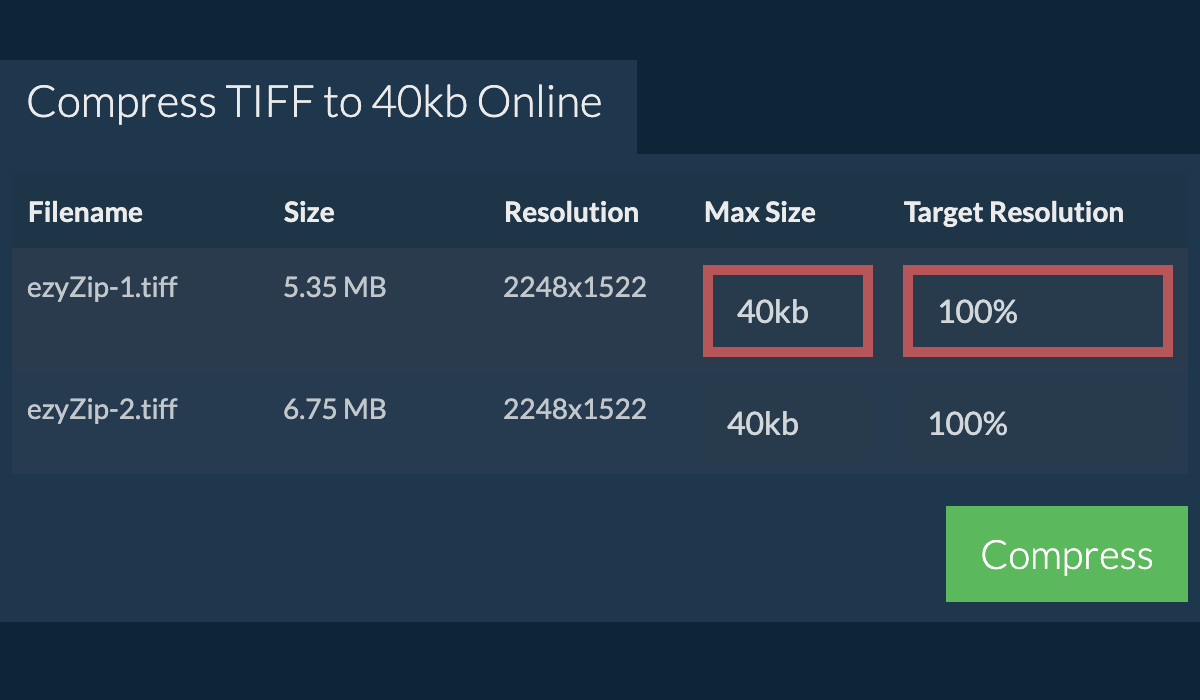 ezyZip is a set of utilities for dealing with compressed files. It is a free online utility to compress your files to a smaller size, including this TIFF to 40kb file size reducer. No need to install any additional software. It supports a myriad of other image compression options too.