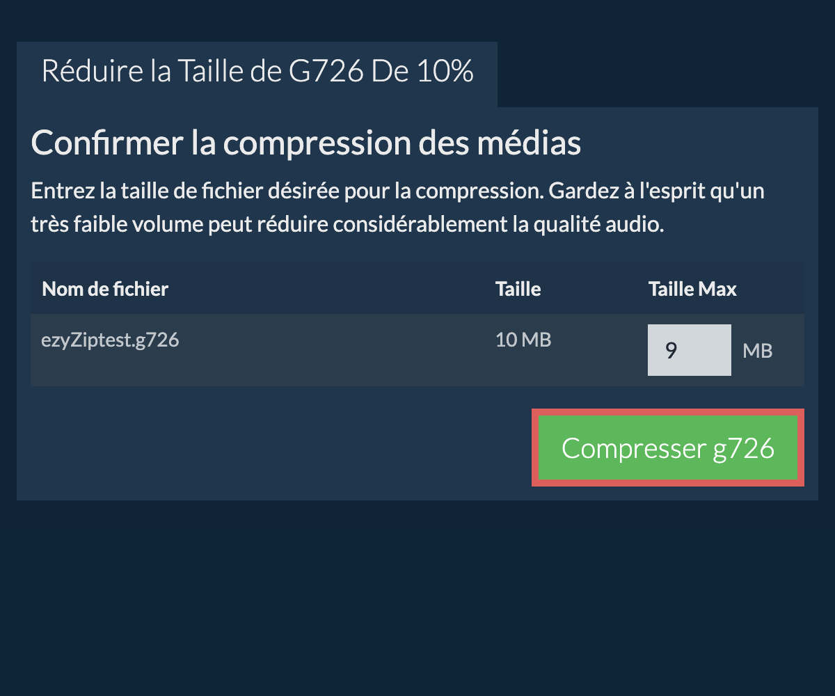 Cliquez sur "Sélectionnez le fichier g726 à compresser" pour ouvrir le sélecteur de fichiers - Cliquez sur "Compresser G726". Cela démarrera le processus de compression qui prendra un certain temps à compléter.