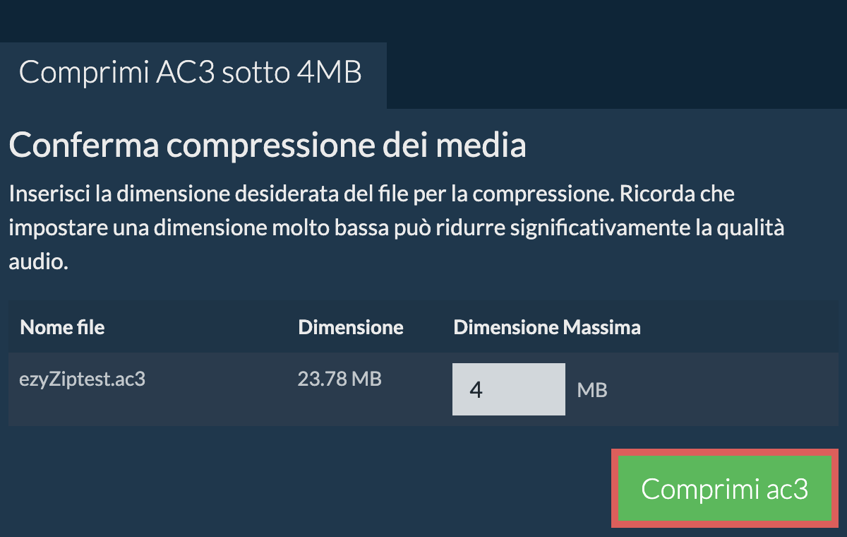 ezyZip è un riduttore di dimensione file ac3 a 4MB online gratuito che funziona nel tuo browser. Non è necessario installare software di compressione aggiuntivi. Supporta anche una miriade di altre compressioni di media.