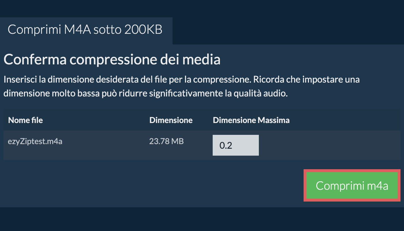 Clicca su "Seleziona file m4a da comprimere" per aprire il selettore di file - Clicca su "Comprimi M4A". Inizierà il processo di compressione che richiederà del tempo per completarsi.