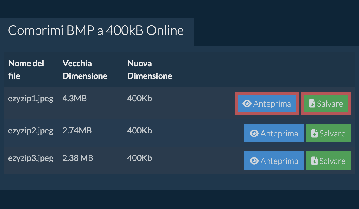 - Una volta compressi tutti i file, ti verranno presentati nuovamente i file. Clicca su "Anteprima" per vedere le nuove immagini nel browser. Se sei soddisfatto, clicca su "Salva" per salvare i file compressi sul tuo computer.