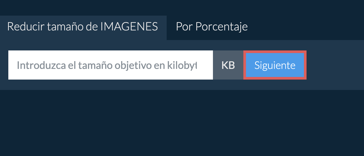 - Para reducir IMAGENES por porcentaje, haga clic en la pestaña "Por Porcentaje" e introduzca la reducción porcentual deseada. Ej. 30 para una reducción del tamaño del archivo del 30% y haga clic en "Siguiente".