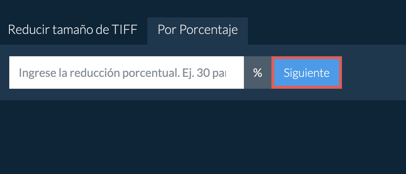 - Para reducir TIFF por porcentaje, haga clic en la pestaña "Por Porcentaje" e introduzca la reducción porcentual deseada. Ej. 30 para una reducción del tamaño del archivo del 30% y haga clic en "Siguiente".