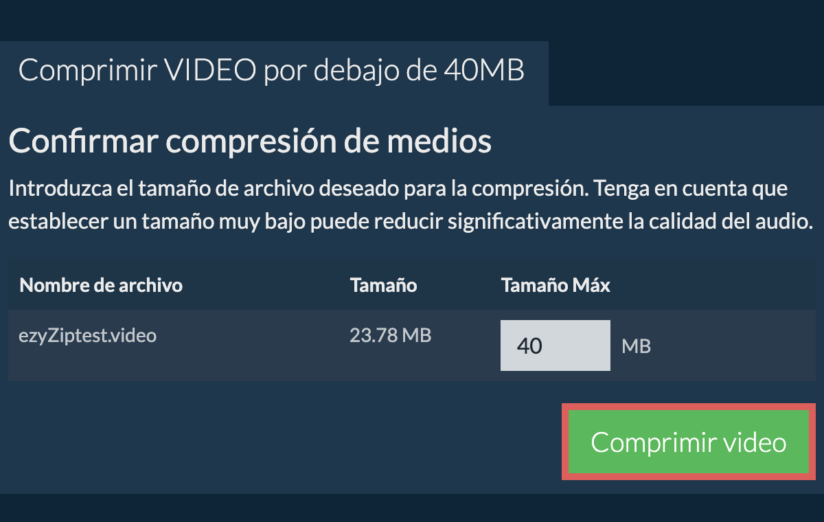 ezyZip es un reductor de tamaño de archivos video a 40MB en línea gratuito que funciona en su navegador. No es necesario instalar ningún software adicional de compresión. También admite una miríada de otras compresiones de medios.