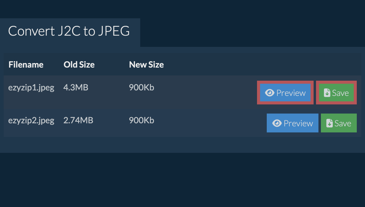ezyZip is a set of utilities for compressing and converting files, including this J2C to JPEG converter. No need to install any additional software. It supports a myriad of other image conversion options too.