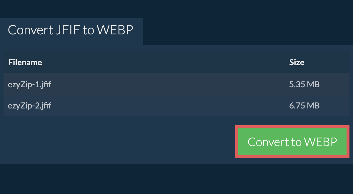 ezyZip is a set of utilities for compressing and converting files, including this JFIF to WEBP converter. No need to install any additional software. It supports a myriad of other image conversion options too.