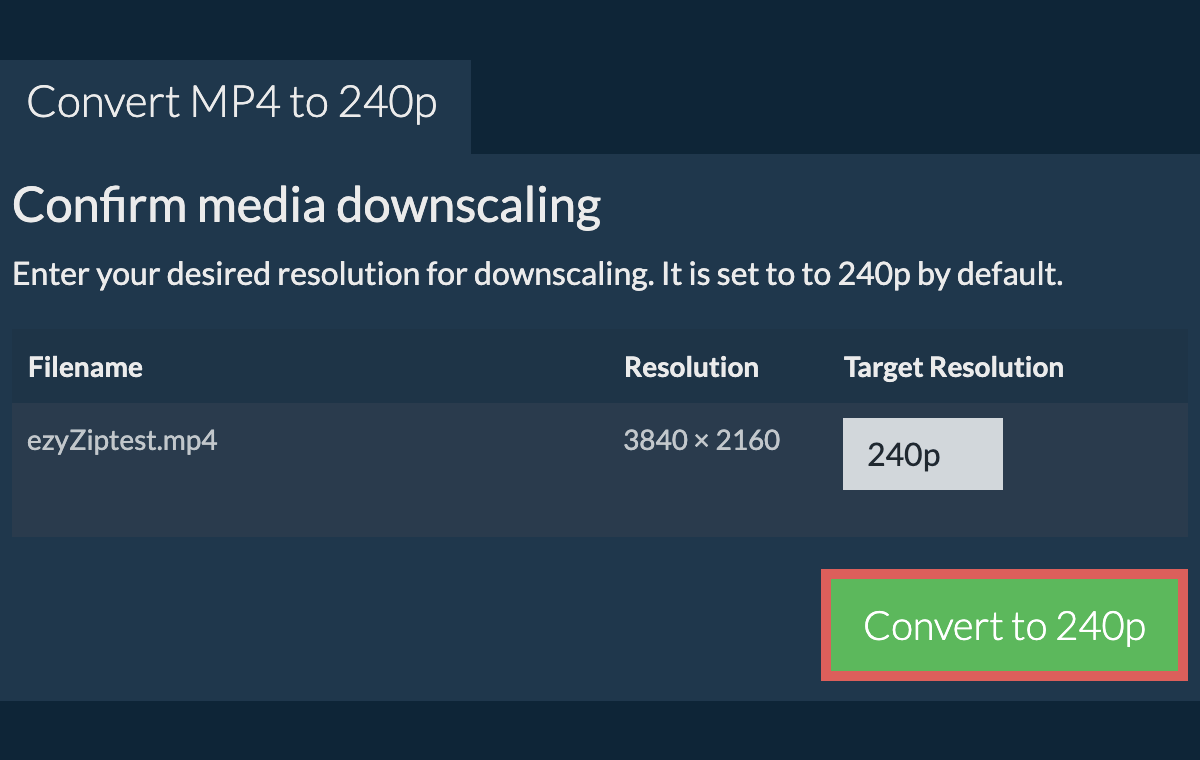 ezyZip is a free online mp4 to 240p resolution downscaler that runs in your browser. No need to install any additional compression software. It supports a myriad of other media types and resolutions.