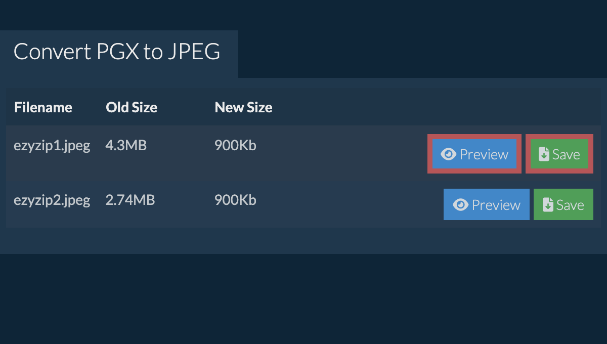 Step by step instructions showing how to convert PGX to JPEG image online using ezyZip.