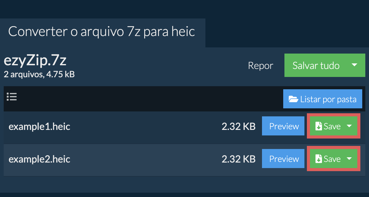 Irá elencar todos os ficheiros HEIC no arquivo 7Z. - Clique no botão verde "Guardar" para guardar o ficheiro HEIC individual no seu disco local.