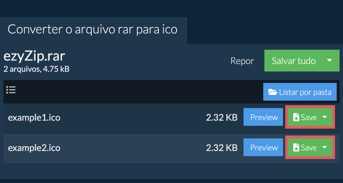 Irá elencar todos os ficheiros ICO no arquivo RAR. - Clique no botão verde "Guardar" para guardar o ficheiro ICO individual no seu disco local.