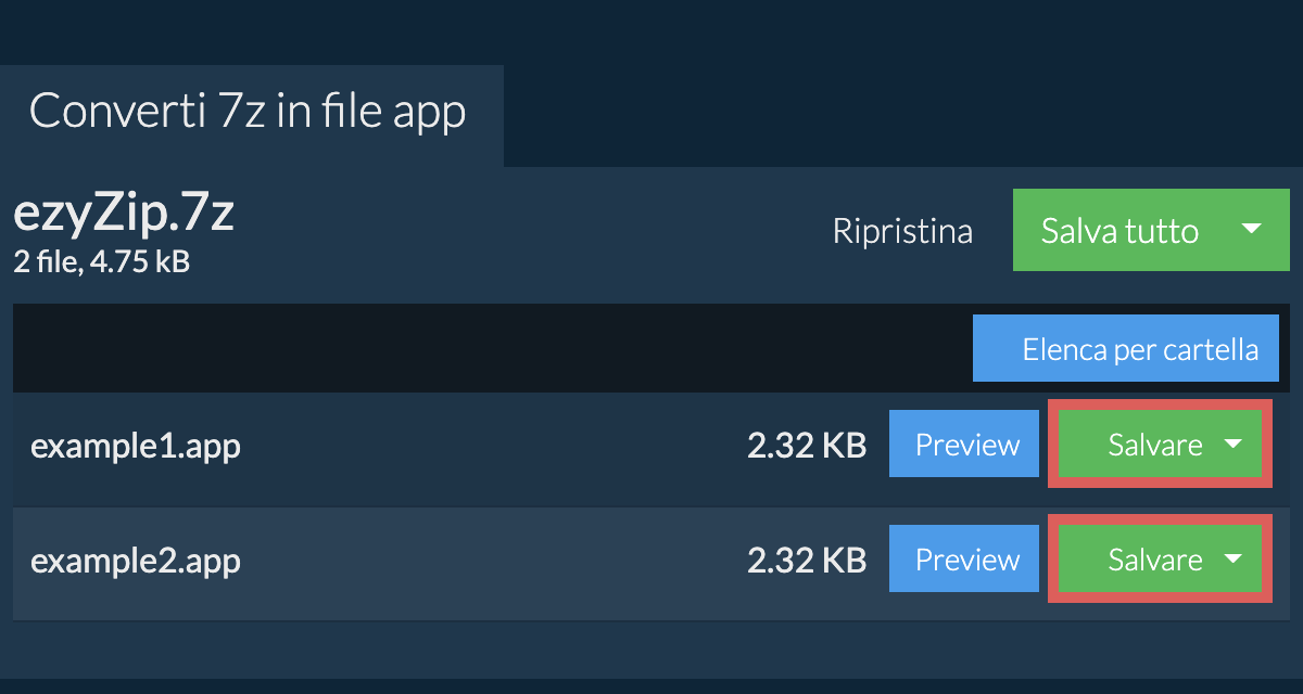 Elencherà tutti i file APP nell'archivio 7Z. - Fare clic sul pulsante verde "Salva" per salvare i singoli file APP sull'unità locale.