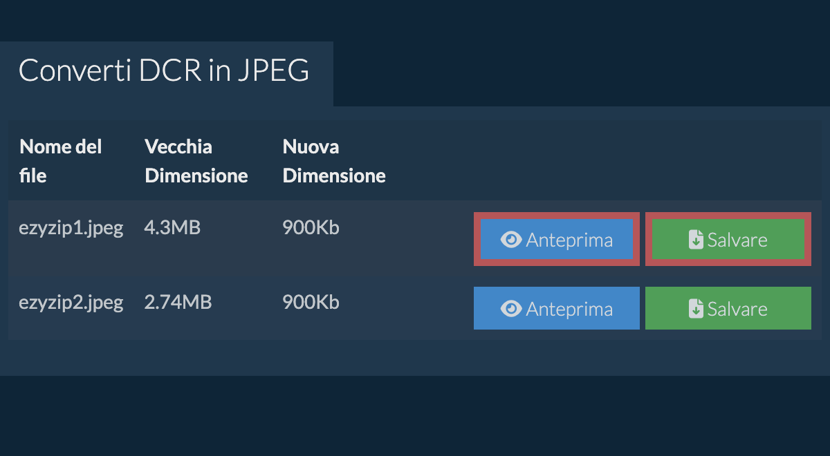 - Una volta convertiti tutti i file, ti verranno presentati nuovamente i file. Clicca su "Anteprima" per vedere le nuove immagini nel browser. Se sei soddisfatto, clicca su "Salva" per salvare i file convertiti sul tuo computer.