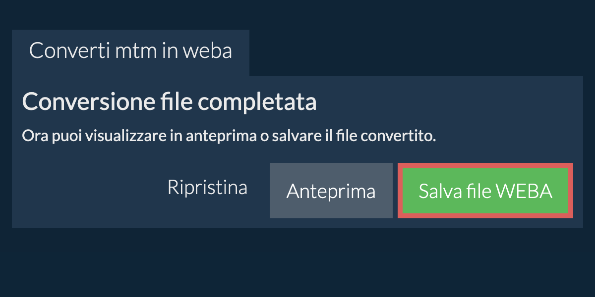 Clicca su "Seleziona il file MTM da convertire" per aprire la selezione file - Clicca su "Converti in WEBA". Inizierà il processo di conversione che richiederà un po di tempo per completare.