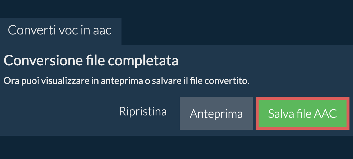 Clicca su "Seleziona il file VOC da convertire" per aprire la selezione file - Clicca su "Converti in AAC". Inizierà il processo di conversione che richiederà un po di tempo per completare.