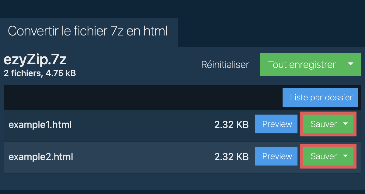 Il énumère tous les fichiers HTML dans l'archive 7Z. - Cliquez sur le bouton vert "Enregistrer" pour enregistrer un fichier HTML individuel sur votre disque local.