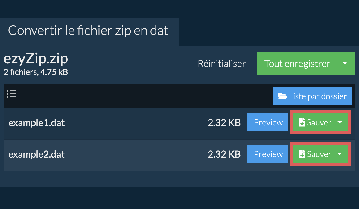 Il énumère tous les fichiers DAT dans l'archive ZIP. - Cliquez sur le bouton vert "Enregistrer" pour enregistrer un fichier DAT individuel sur votre disque local.