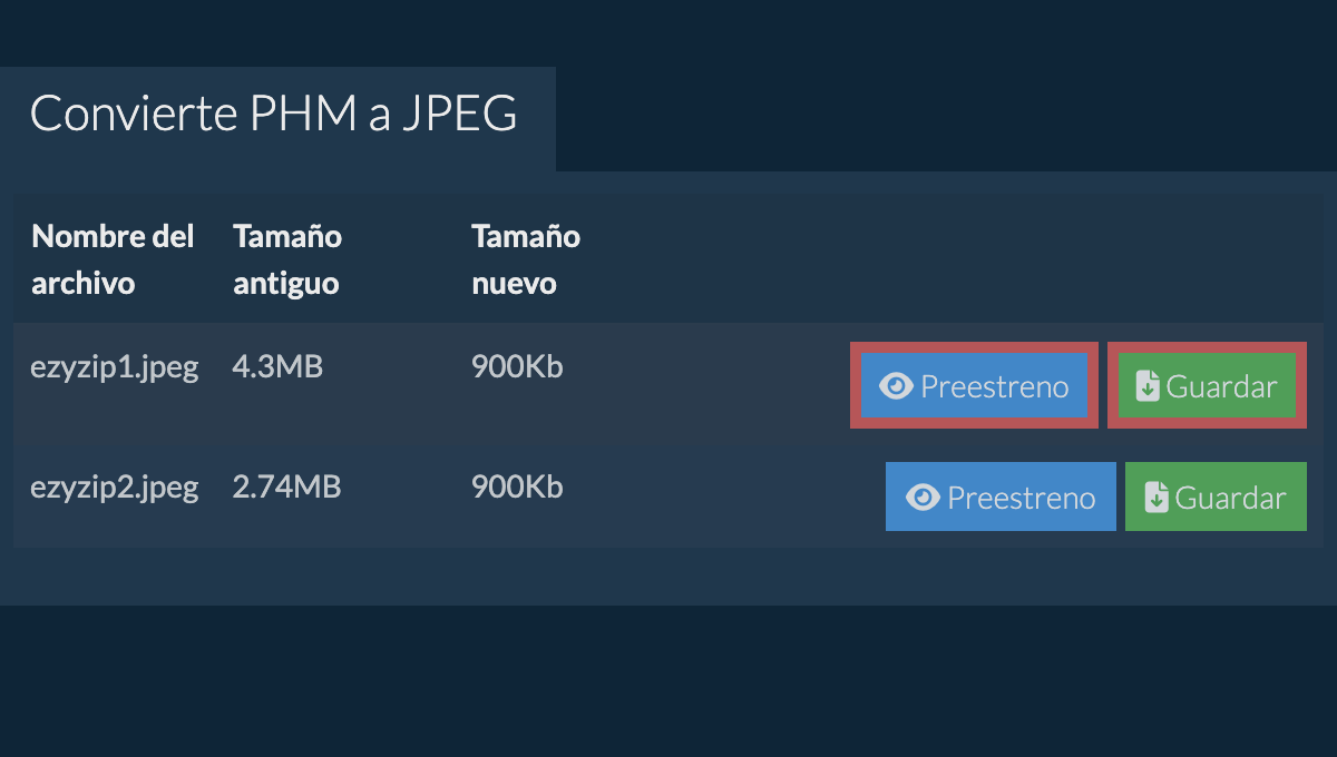 Instrucciones paso a paso que muestran cómo convertir una imagen PHM a JPEG en línea usando ezyZip.