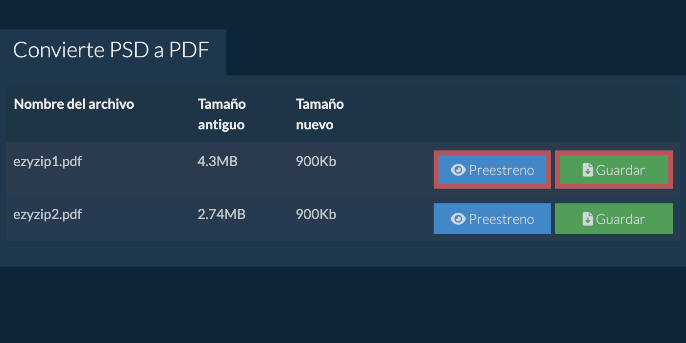 Instrucciones paso a paso que muestran cómo convertir una imagen PSD a PDF en línea usando ezyZip.