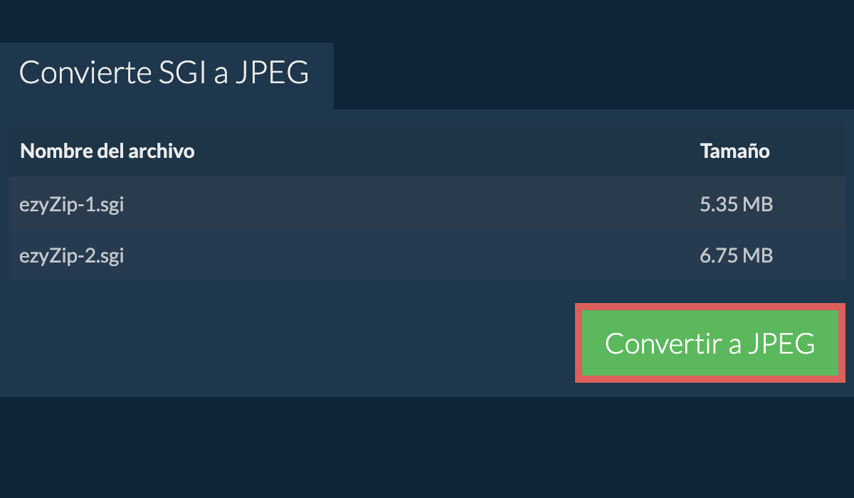 Instrucciones paso a paso que muestran cómo convertir una imagen SGI a JPEG en línea usando ezyZip.