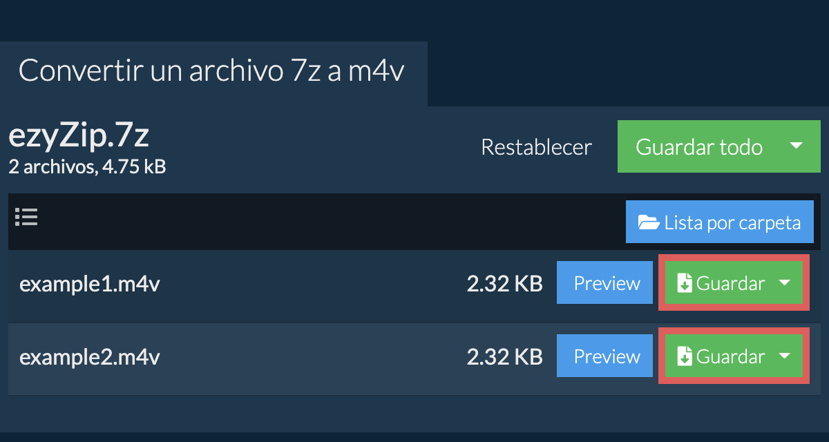 Se enumerarán todos los archivos M4V en el archivo 7Z. - Haga clic en el botón verde "Guardar" para guardar un archivo M4V individual en su unidad local.