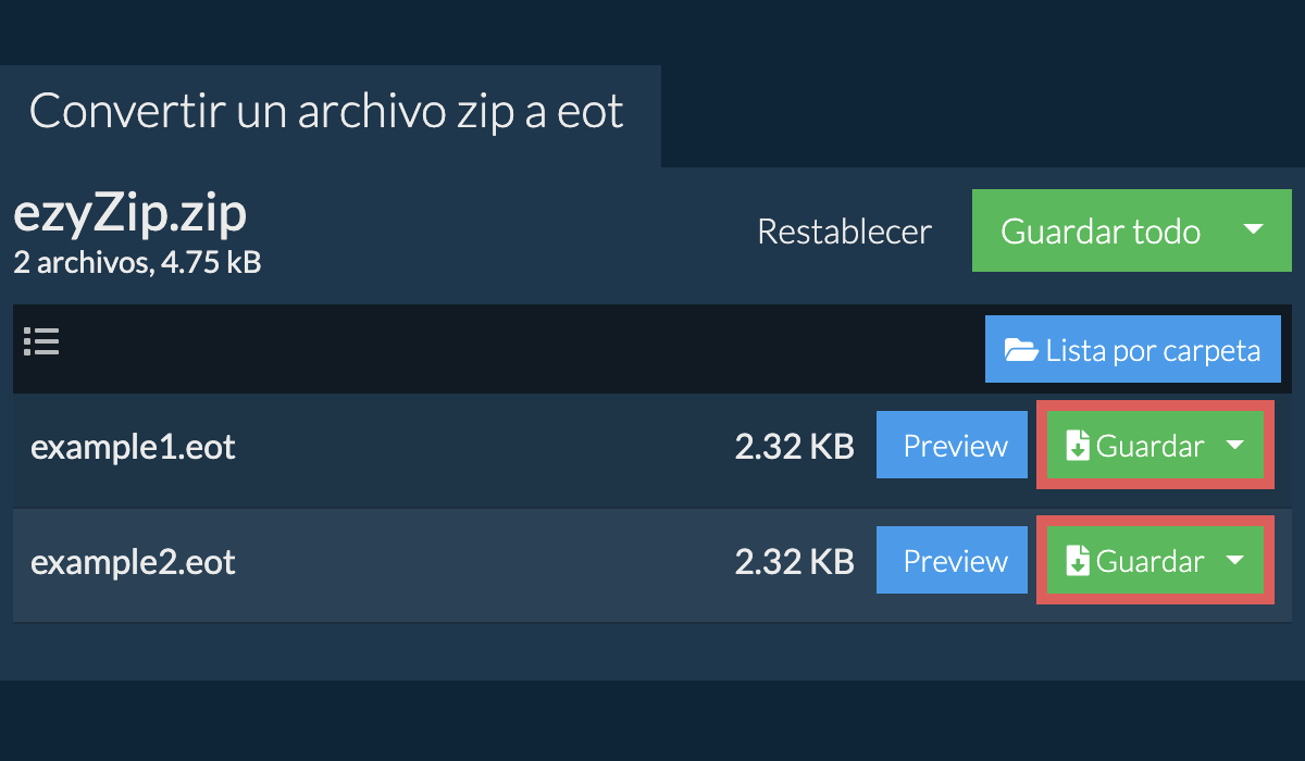 Se enumerarán todos los archivos EOT en el archivo ZIP. - Haga clic en el botón verde "Guardar" para guardar un archivo EOT individual en su unidad local.