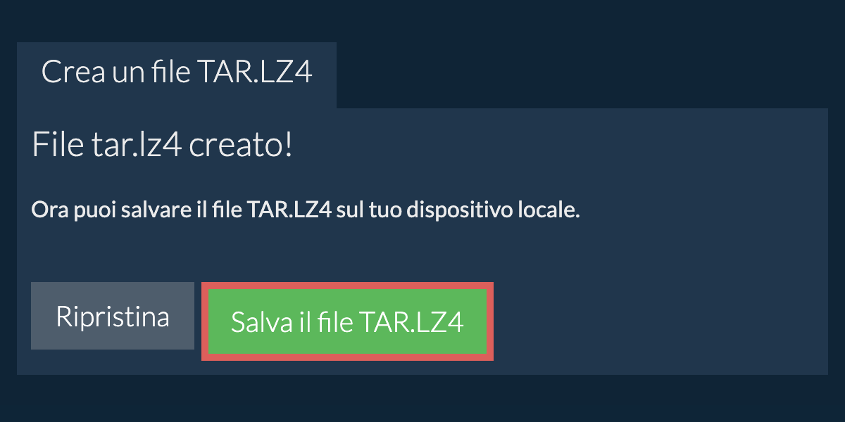 - Clicca su "Salva il file TAR.LZ4" per salvare l'archivio nella cartella di destinazione selezionata.