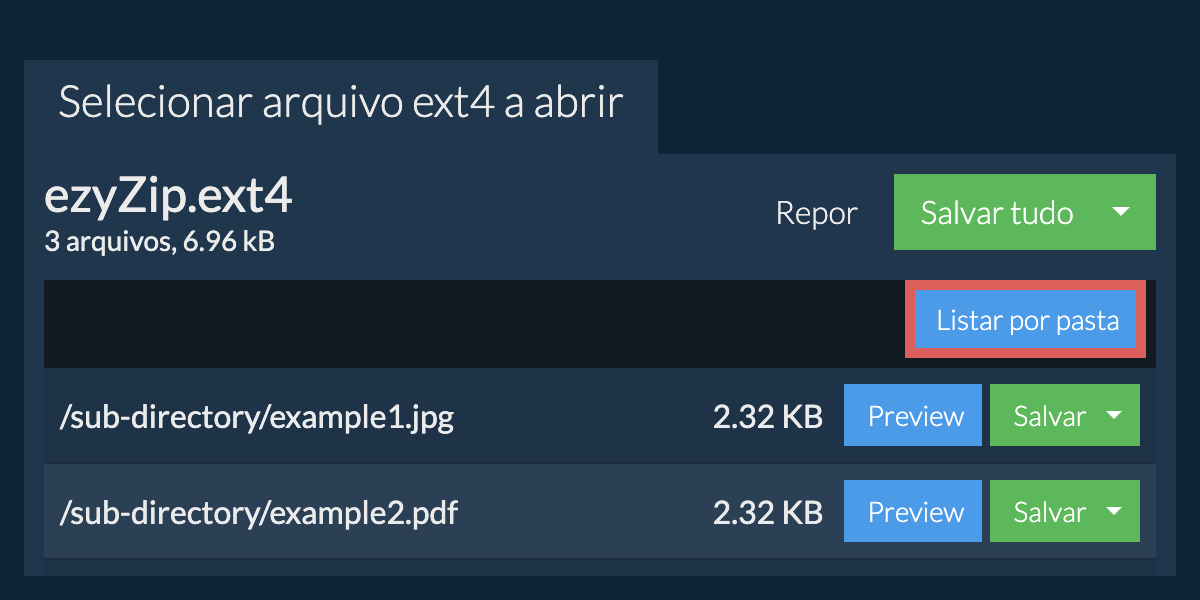 Sim, o ezyZip oferece um recurso especializado de pré-visualização de conteúdo de arquivo que permite visualizar o conteúdo de certos tipos de arquivos dentro de seus arquivos EXT4 sem a necessidade de extraí-los. Este recurso suporta uma variedade de tipos de arquivos, incluindo imagens, áudio, vídeo e documentos, proporcionando uma maneira rápida e conveniente de verificar ou revisar o conteúdo desses arquivos dentro de seus arquivos. Basta clicar no botão azul "Pré-visualizar".