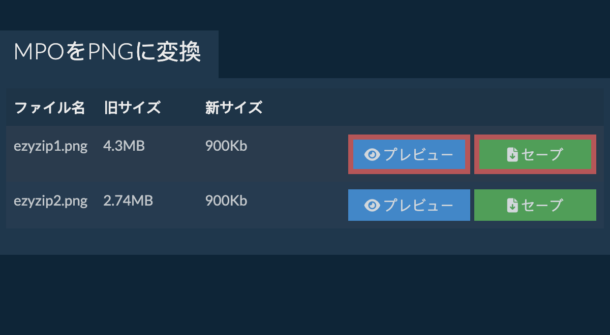 - すべてのファイルが変換されたら、再度ファイルが表示されます。「プレビュー」をクリックしてブラウザで新しい画像を見ます。それで良ければ、「保存」をクリックして変換したファイルをコンピュータに保存します。