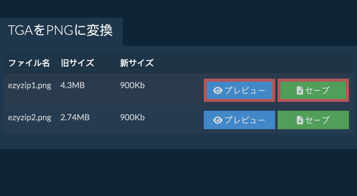 - すべてのファイルが変換されたら、再度ファイルが表示されます。「プレビュー」をクリックしてブラウザで新しい画像を見ます。それで良ければ、「保存」をクリックして変換したファイルをコンピュータに保存します。