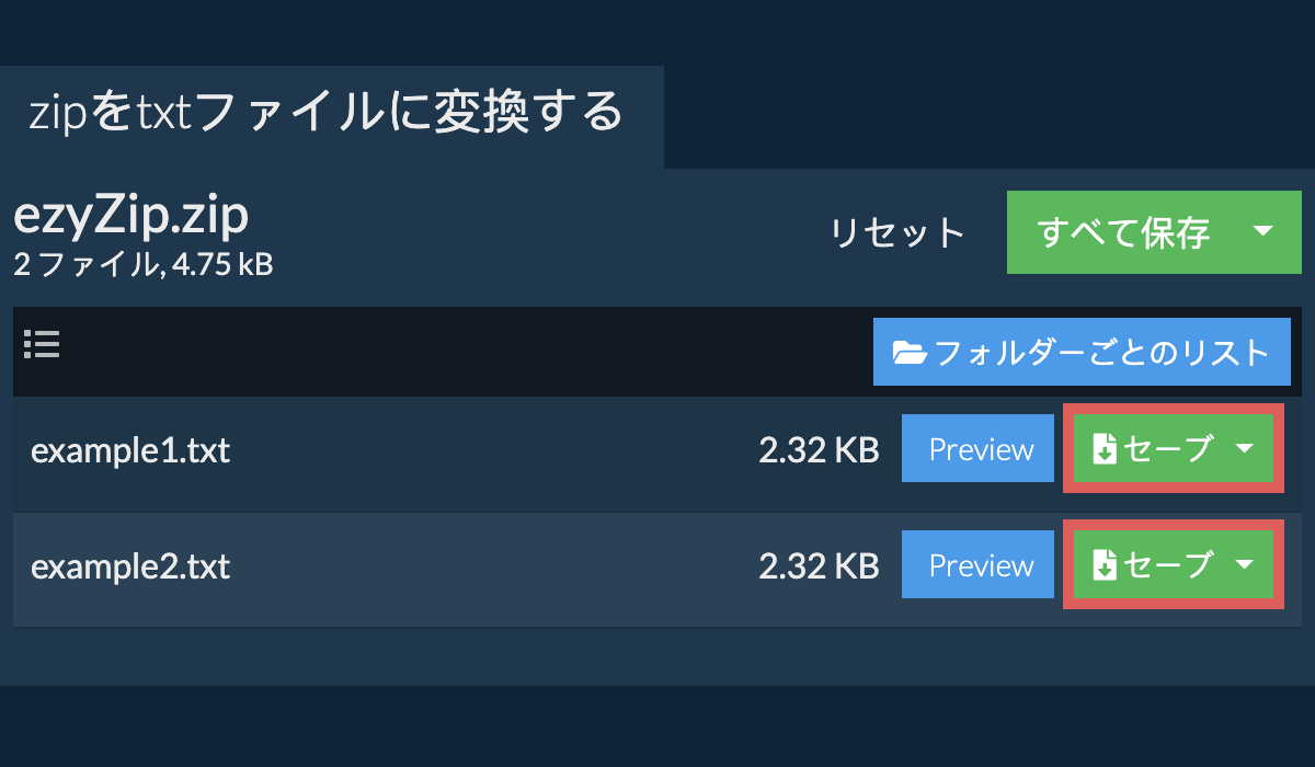 ZIP アーカイブ内のすべての TXT ファイルの一覧が表示されます。 - 緑色の「保存」ボタンをクリックして、個々のTXTファイルをローカルドライブに保存します。