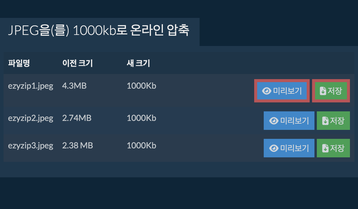 - 모든 파일이 압축되면 다시 파일이 표시됩니다. "미리보기"를 클릭하여 브라우저에서 새 이미지를 확인하세요. 만족스러우면 "저장"을 클릭하여 압축된 파일을 컴퓨터에 저장하세요.